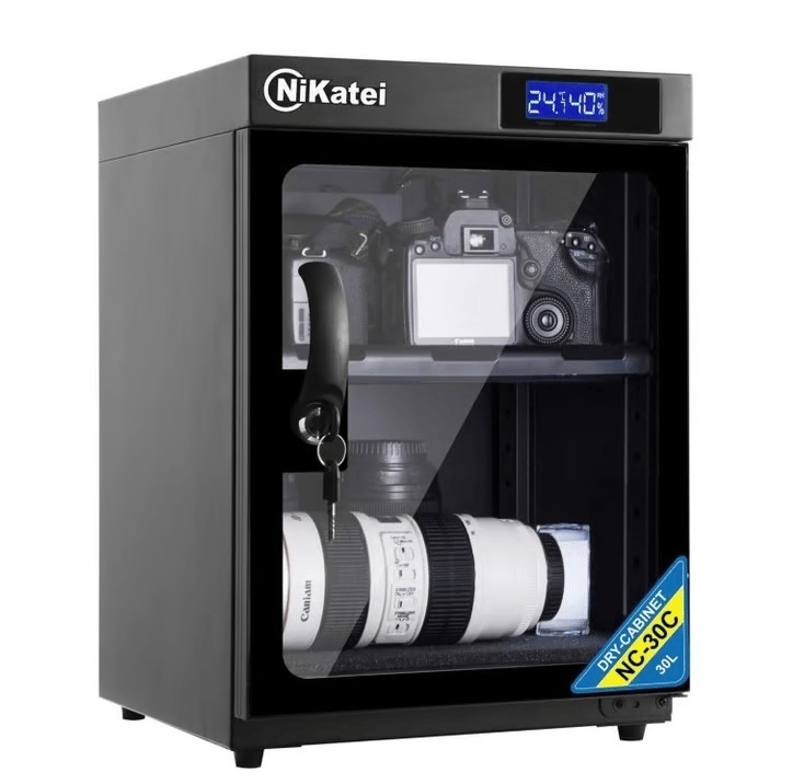 Nikatei NC-30C là một tủ chống ẩm chuyên dụng dung tích 30 lít, được thiết kế để bảo quản máy ảnh, ống kính, thiết bị điện tử và các vật dụng nhạy cảm với độ ẩm, giúp hạn chế tình trạng mốc, han gỉ và hư hỏng do môi trường ẩm ướt gây ra. Sản phẩm sử dụng công nghệ hút ẩm IC hiện đại, cho khả năng kiểm soát độ ẩm trong khoảng từ khoảng 25 % – 60 %, hoạt động hiệu quả với mức tiêu thụ điện năng thấp. Thiết kế gọn nhẹ, có màn hình hiển thị LED và khay đựng có thể tháo rời giúp bạn dễ dàng sắp xếp và bảo quản thiết bị một cách an toàn và khoa học.