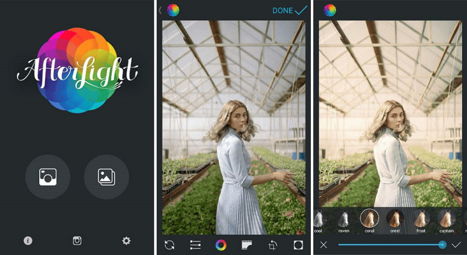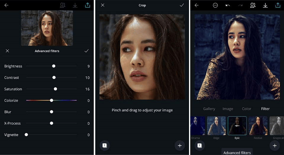 Ứng dụng này cũng bao gồm một số bộ lọc có thể điều chỉnh và cung cấp cho bạn khả năng xuất ảnh thành phẩm của mình trực tiếp lên mạng truyền thông xã hội.