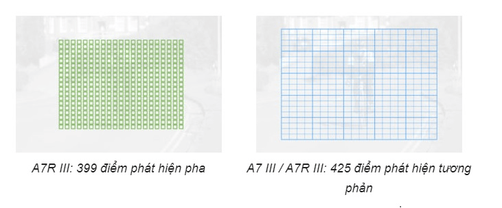 Máy ảnh Sony Alpha A7R III có 399 điểm lấy nét theo pha chiếm 68% diện tích cảm biến hình ảnh. Ngoài ra còn có 425 điểm phát hiện tương phản. Các điểm tương phản được sử dụng ở chế độ AF đơn (tùy thuộc vào cài đặt) hoặc khi không có đủ ánh sáng để phát hiện theo pha hoạt động.