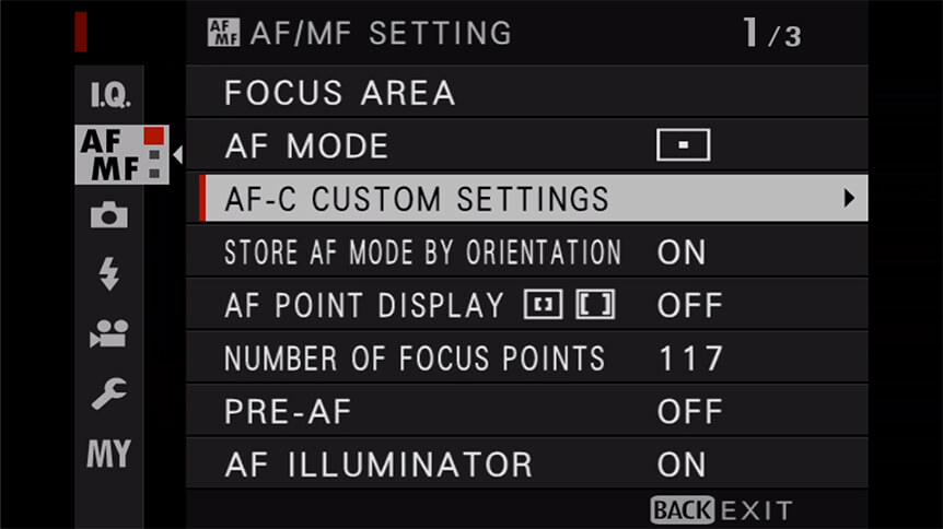 Bạn có thể cá nhân hóa cài đặt AF-C của mình theo ba cách: theo dõi độ nhạy, độ nhạy theo dõi tốc độ và chuyển đổi khu vực. Điều này nghe có vẻ phức tạp, nhưng nó đơn giản như chọn một trong năm giá trị đặt trước, mỗi giá trị được gắn nhãn với loại chuyển động phù hợp nhất. Để truy cập các cài đặt trước này: